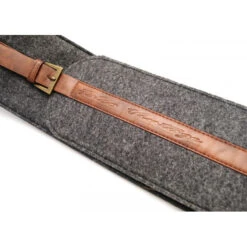 - Des deux côtés, le feutre est complété par une bande en (faux) cuir qui s’étend sur toute la longueur du sac et à un côté comporte une fermeture à boucle de ceinture pour maintenir l’arc en toute sécurité à l’intérieur du sac.